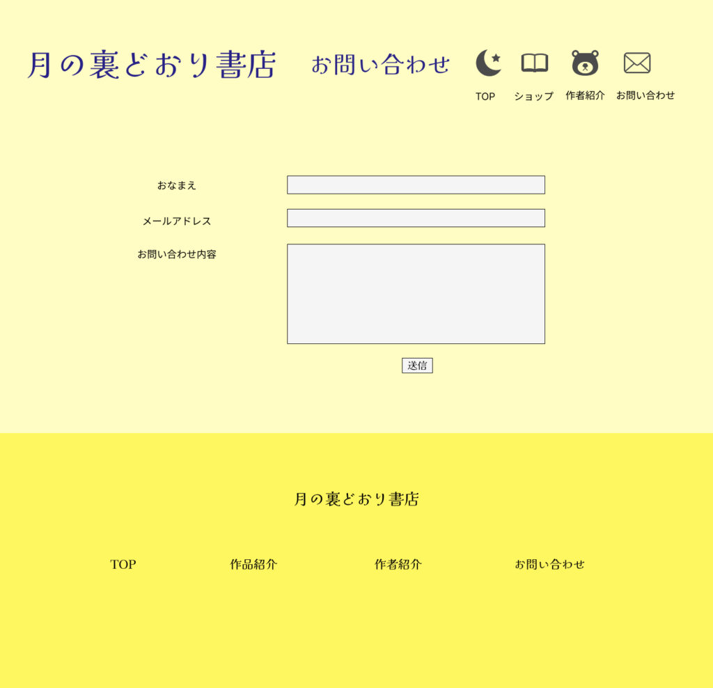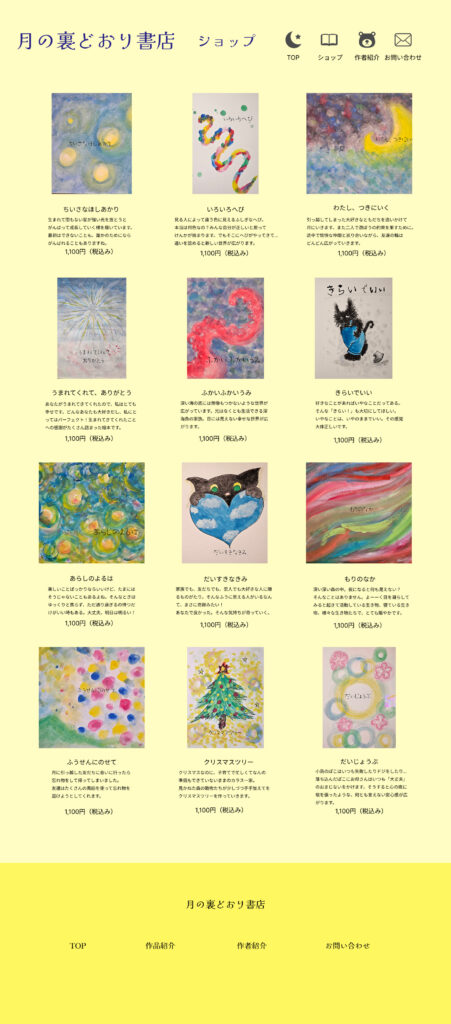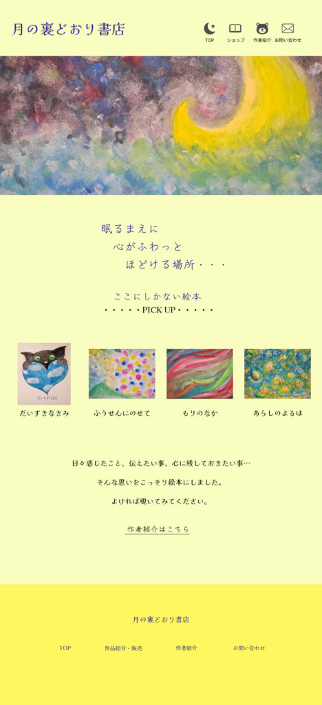 TOP やさしい色で、ここにしかない世界を。 秋田多貴恵のポートフォリオ 制作実績 月の裏通り書店 月と夜をモチーフにした物語サイト。モバイルファースト設計。https://akitatakie0211.shop/book/ 詳しく見る お仕事のご相談・ご依頼はこちらからお気軽にどうぞ。 お問い合わせ